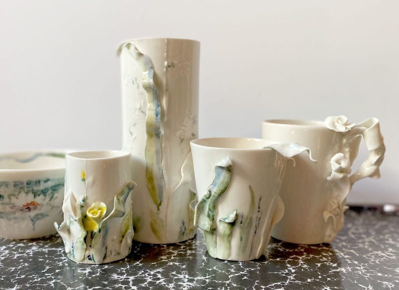 Bei den Porzellanobjekten stehen Blüten und Blätter im Fokus. Schwungvolle Bewegung die durch Unterglasur-Malerei ergänzt wird.